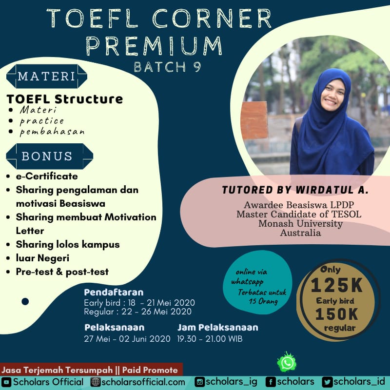 Kursus toefl ibt preparation online terbaik. Tujuan pengajaran bahasa inggris di dalam program percakapan ( conversation) ini diarahkan untuk membekali siswa dengan kemampuan komunikasi sehingga . Toefl, test of english as a foreign language , adalah tes untuk mengukur kemampuan bahasa inggris seseorang di negara di mana bahasa inggris . Learn about toefl itp scoring, how to interpret scores, test score availability and more. 20 kursus lainnya + grup info loker.
